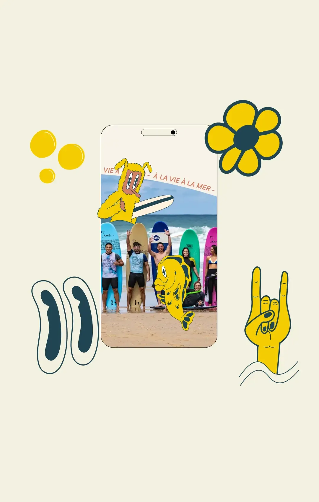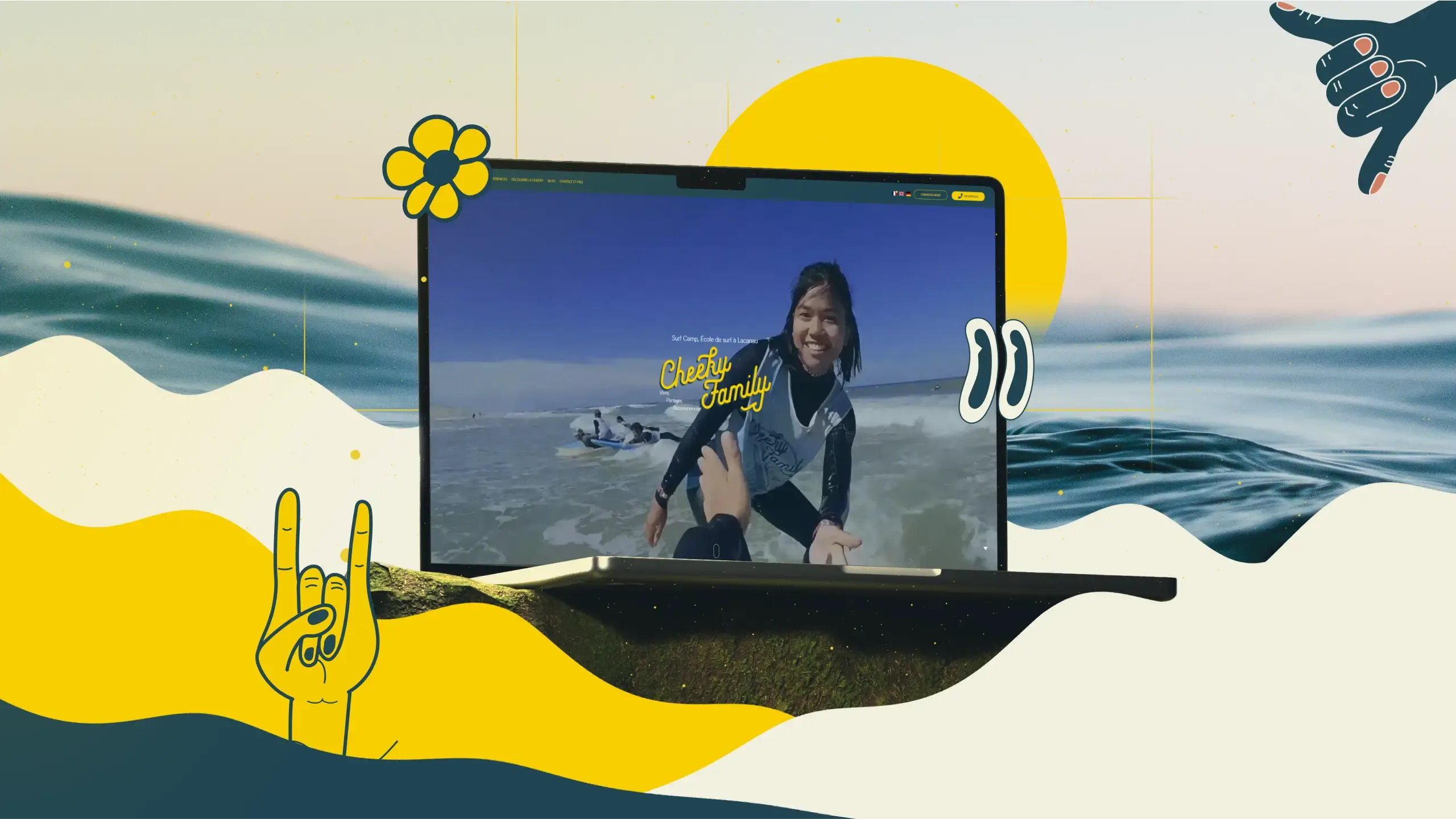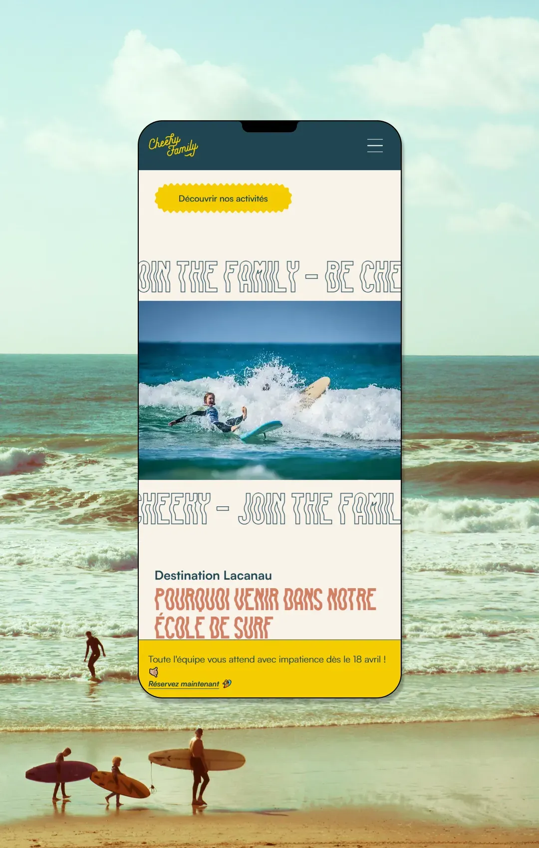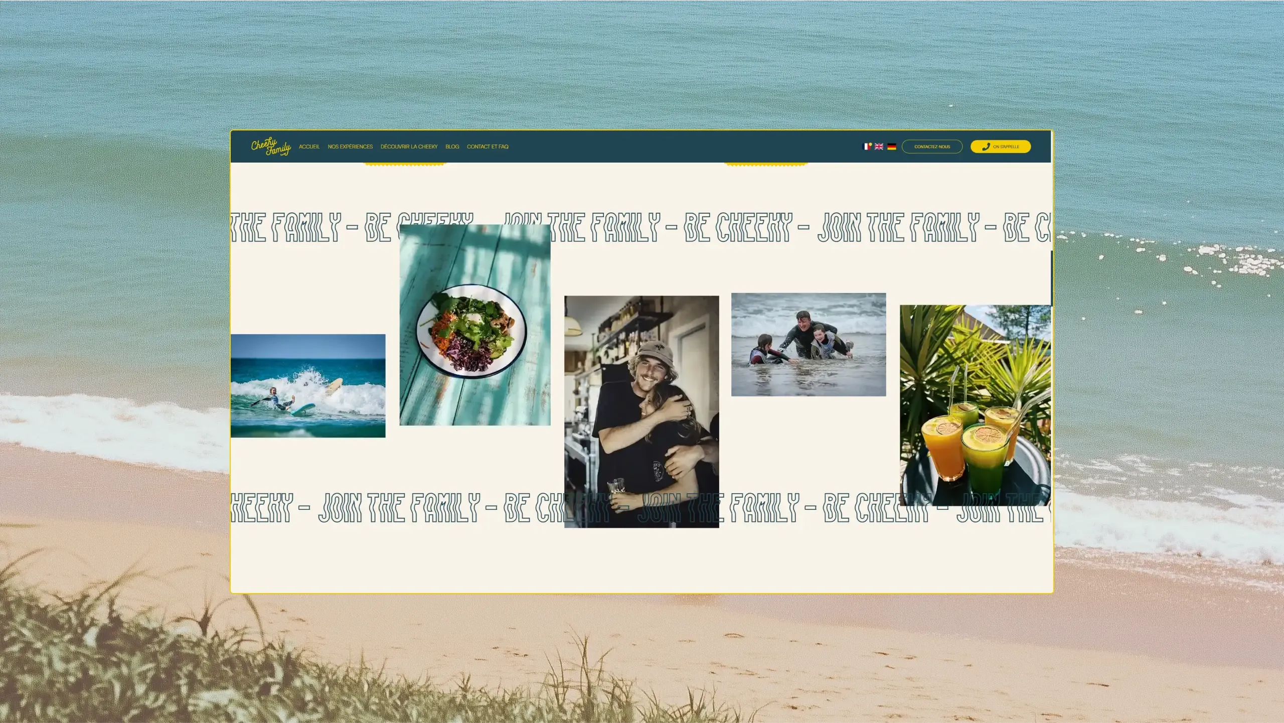 À la fois ponctuation, promesse et signature de marque, “Vivre, Partager, Recommencer” incarne ce qu’est la Cheeky Family. Trois verbes d’actions qui résonnent comme un mantra. Trois valeurs qui s’incarnent comme un serment à ceux tentés par l’aventure du surf et de ses idéaux, du néophyte au plus expert. Le surf camp est d’abord une aventure communautaire, dont la prise de vague n’est finalement qu’une part. Ainsi, nous avons voulu que la Cheeky Family parle directement à son public : ceux qui sont prêts à vivre ces moments de partage.