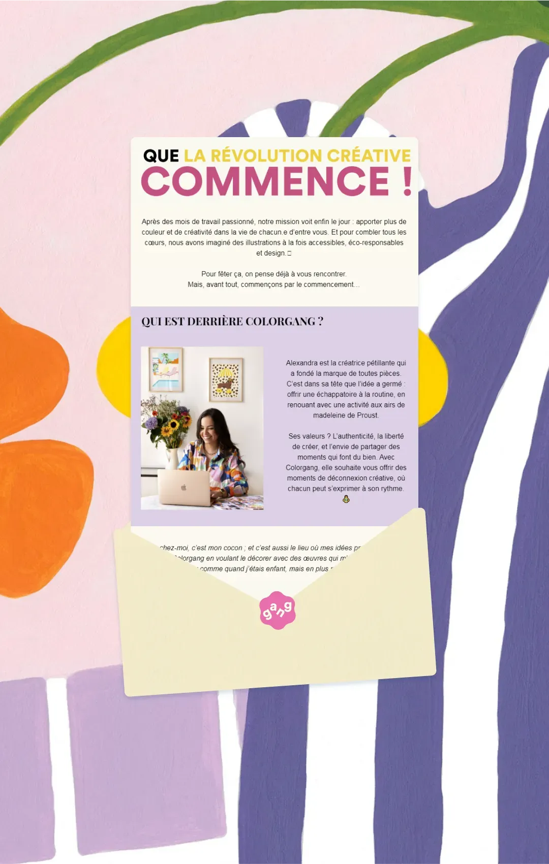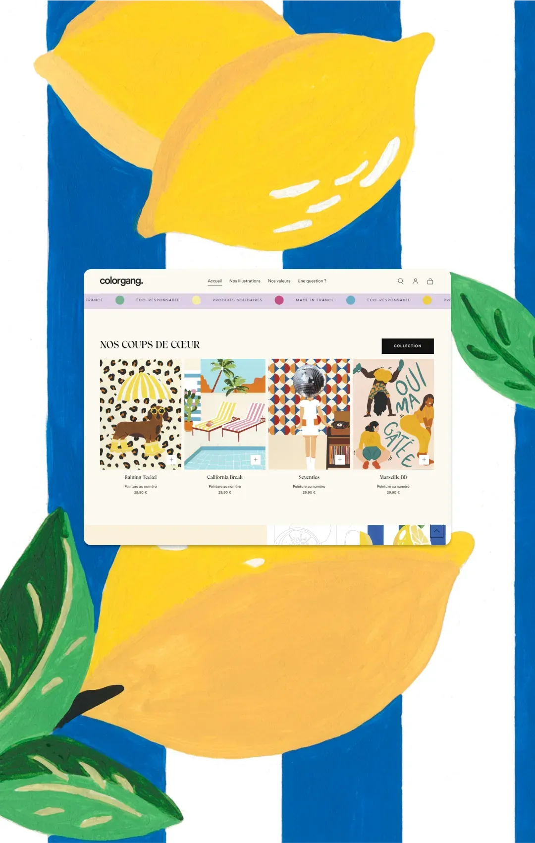Colorgang porte son ambition en étendard : la révolution créative. Des couleurs, de la vie, du soleil, autant d’émotions à transmettre. “Marseille bb”, “Lovely Frida” ou encore “California break”, les peintures par numéro de Colorgang devaient se parer d’un site e-commerce et d’un discours à son image.